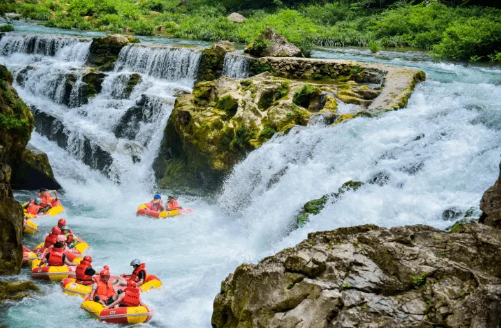 高过河位于镇远县城西北34公里处的羊场镇。由原始森林、峡谷、险滩、飞瀑构成。方圆34平方公里的景区内,植被丰富,古木参天,奇花异草,种类繁多。千年古树,桂、兰、木、莲,国家一、二级保护树种如南方红豆杉、罗汉松、水杉,银杏等随处可见,是一个难得的天然大植物园。这里海拔900米,年平均气温14.5度,有"休闲避暑胜地,度假漂流天堂"之称。